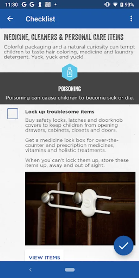 • Keep track of your safety progress with an easy checklist design. From anchoring flat-screen TVs to keeping cosmetics out of reach, this home safety app has you covered.