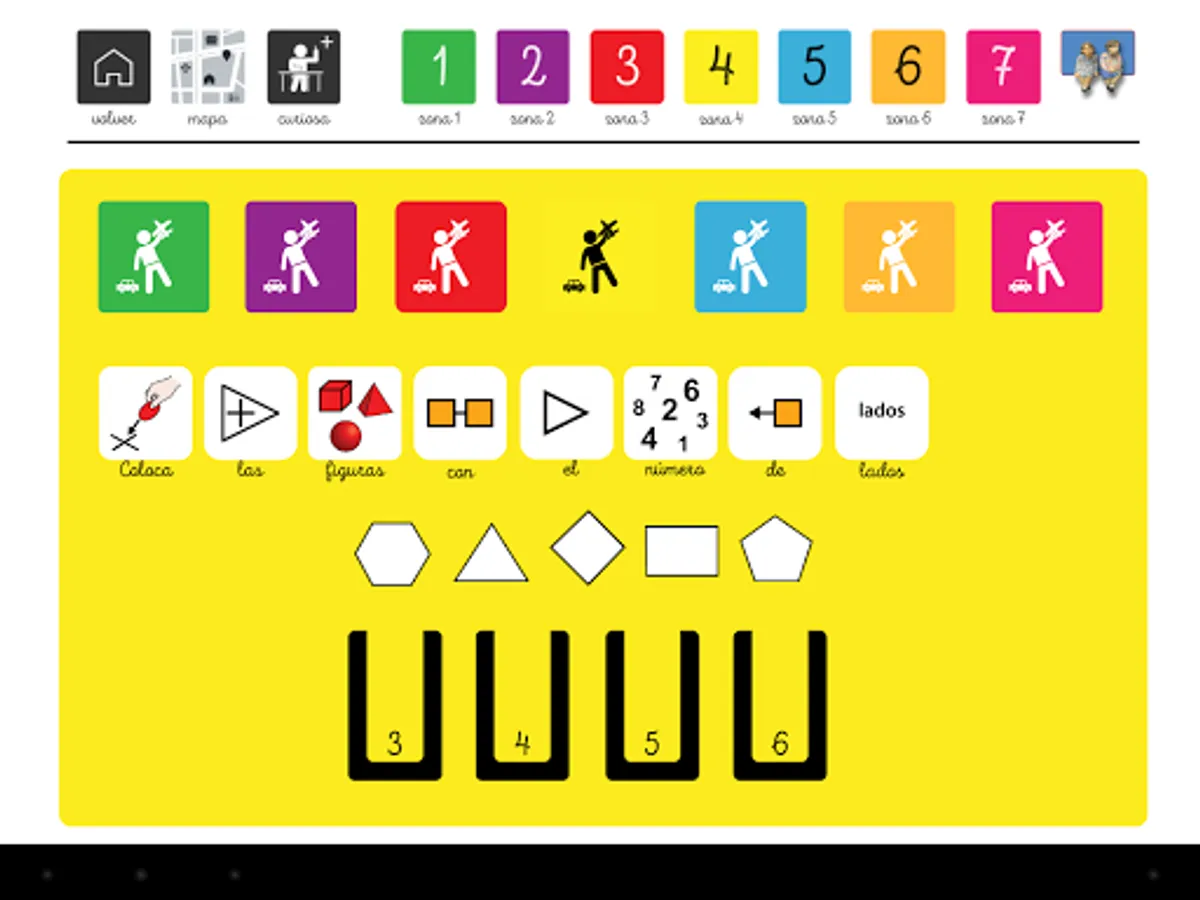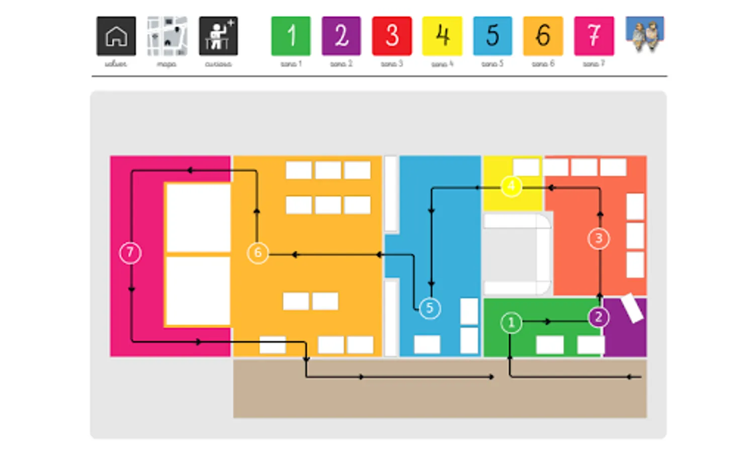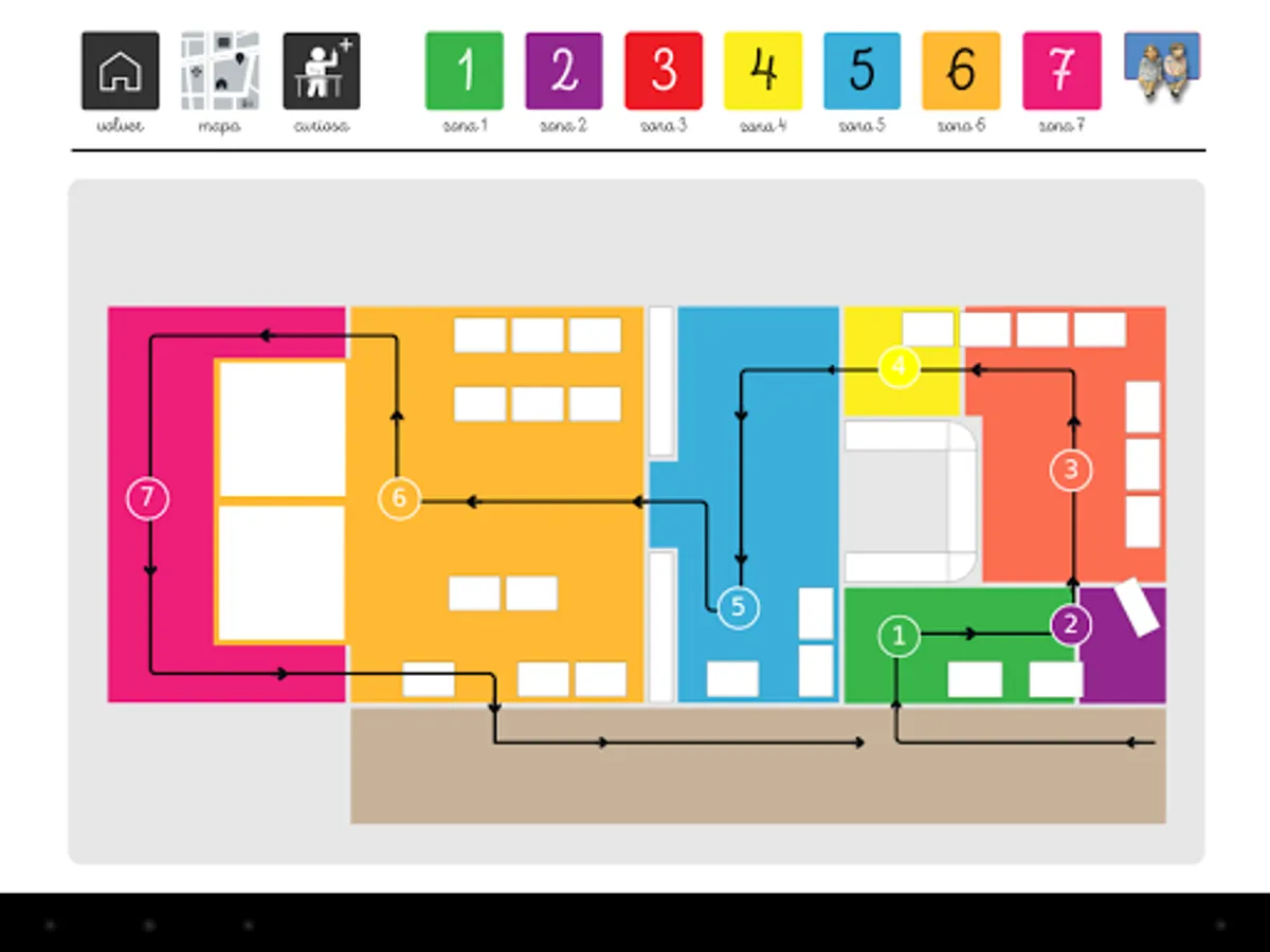 The TEADAPTO app is developed on the structure of the floor plan of the Pedagogical Museum of the University of Huelva, with its real routes and areas differentiated by colors and letters for easier identification by TEA users.