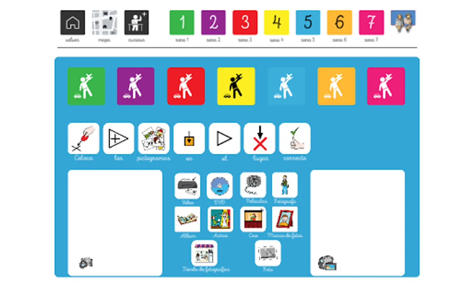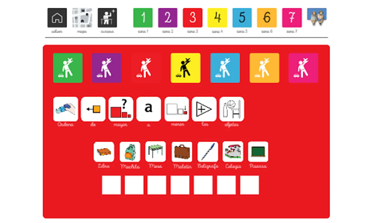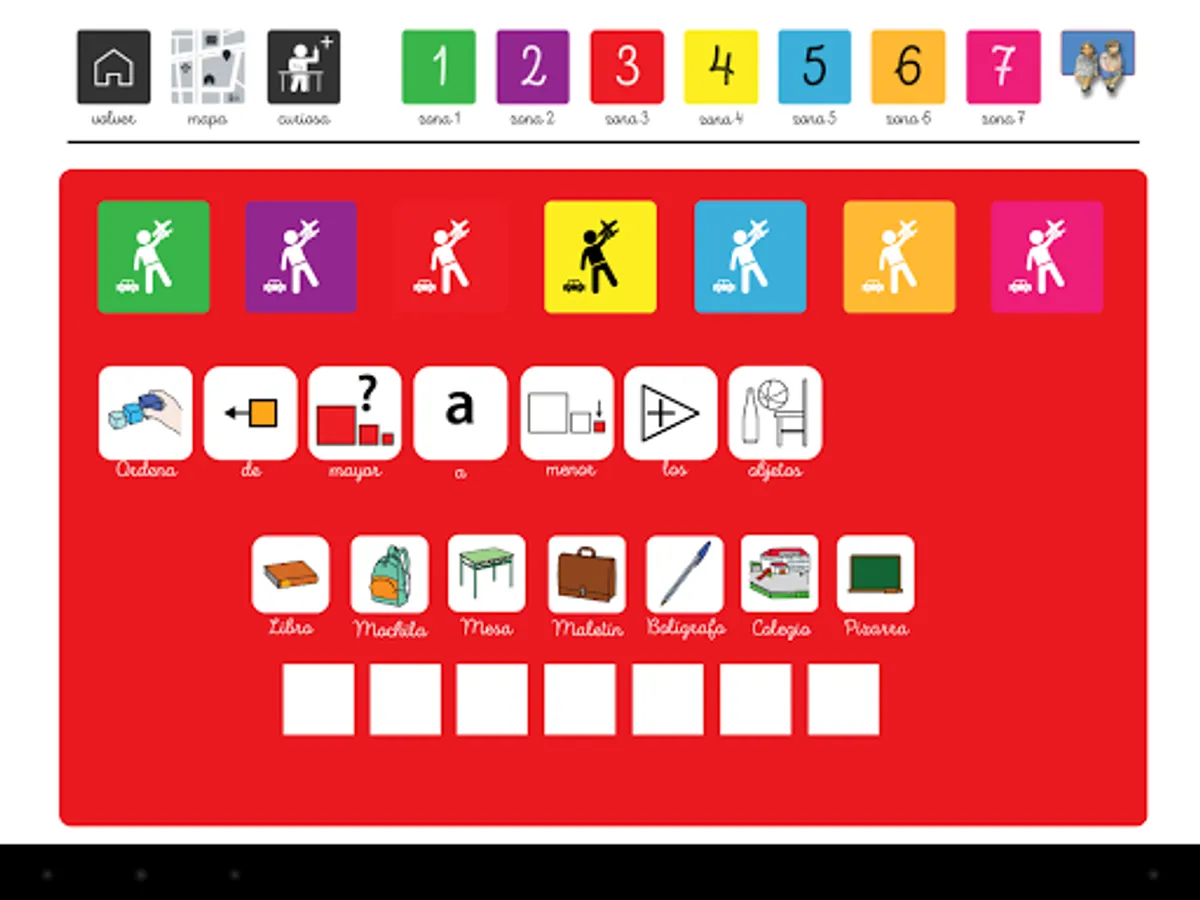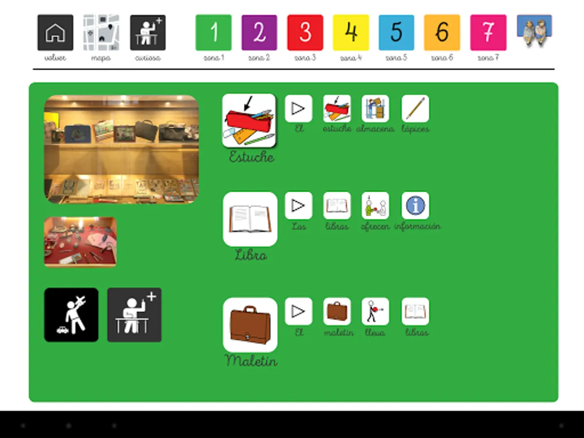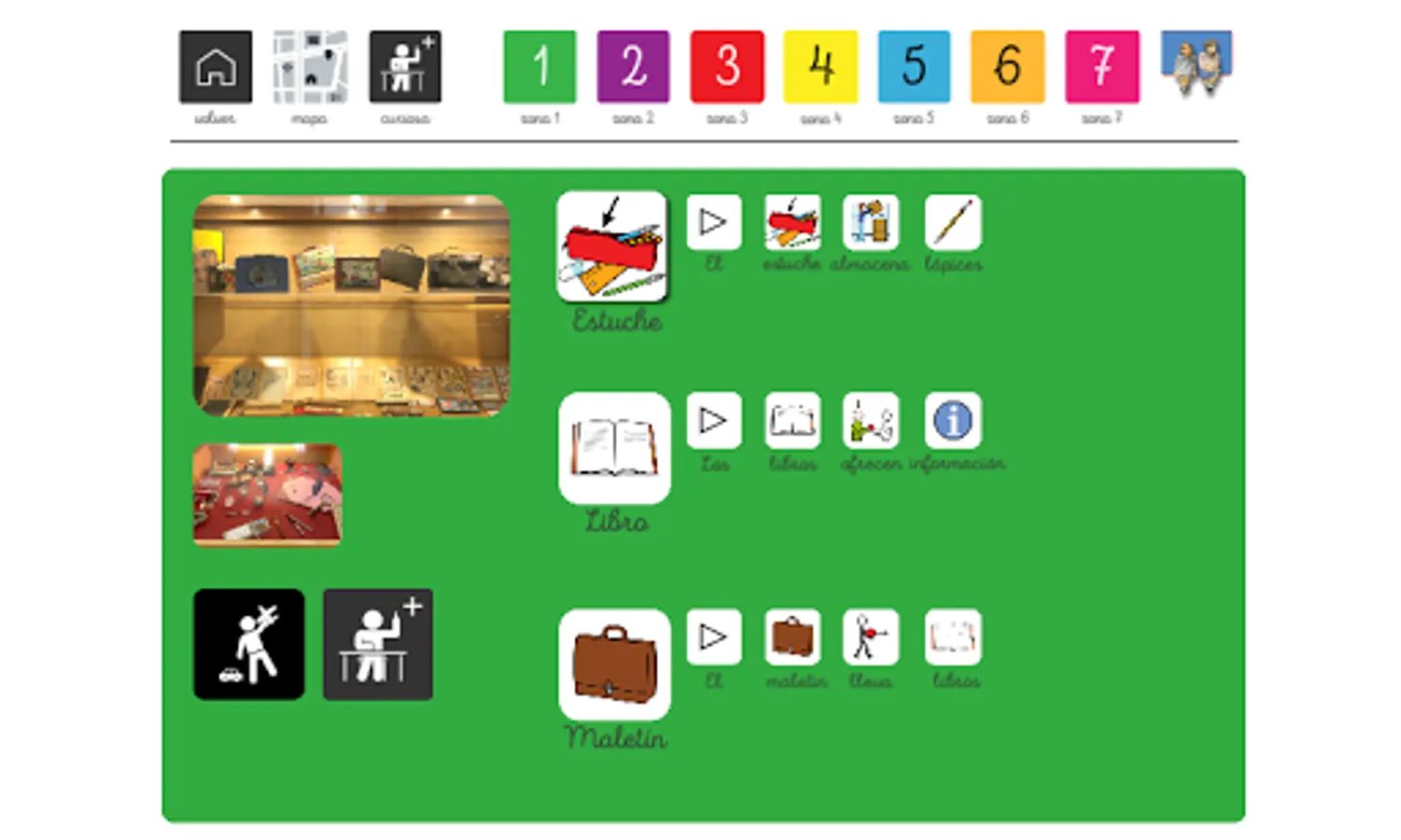 Each color zone also includes different interactive games that make the visit more dynamic and fun, while new concepts are learned and internalized. We also include a dictionary with synonyms of the most relevant objects in each area.