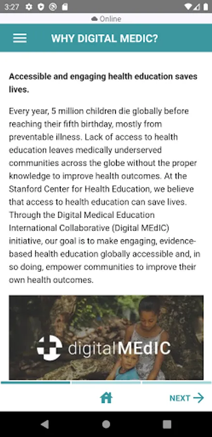 Digital Medic creates compelling, evidence-based health education that is globally accessible. Our goal is to equip communities with credible information that enables them to improve their own health outcomes. We are an initiative of the Stanford Center for Health Education and develop content in direct partnership with active Stanford faculty.