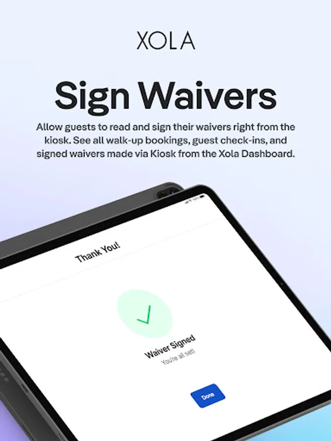 * Xola Waivers - Included at no cost. Guests can quickly and easily read and sign waivers right from the Kiosk.