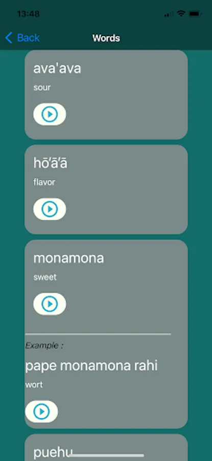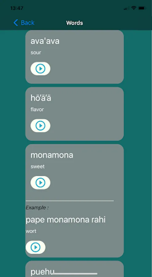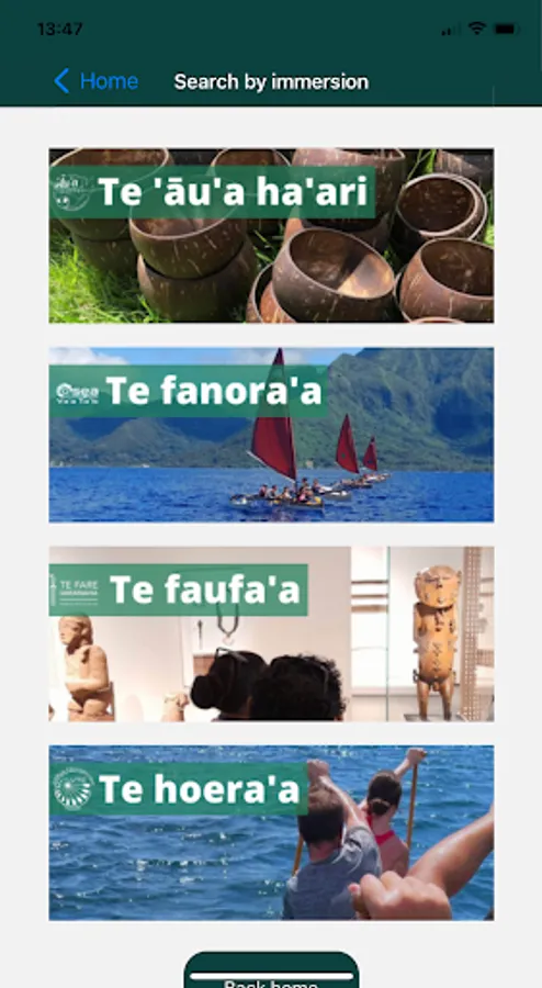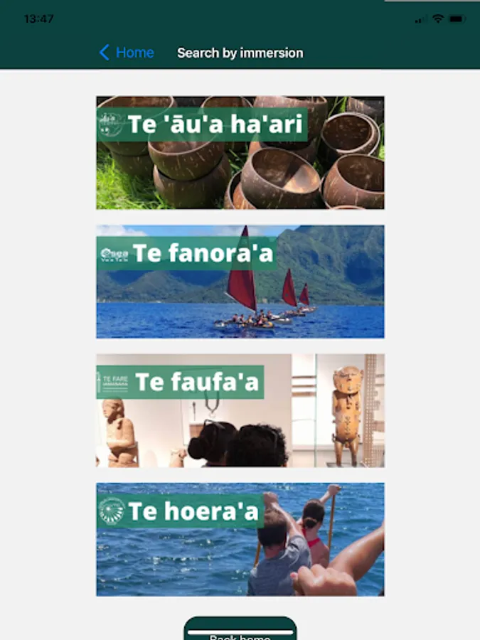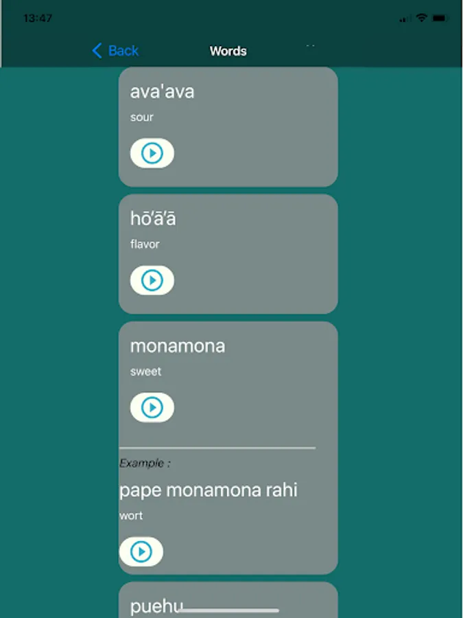 Whether you're a first-time learner or a seasoned enthusiast, Tahuarama makes it easy for you to keep track of all the new words and phrases you'll encounter during your Tahitian adventures. With Tahuarama, you can navigate easily between different immersion themes, from words to full sentences, and practice pronunciation with audio for all vocabulary items.