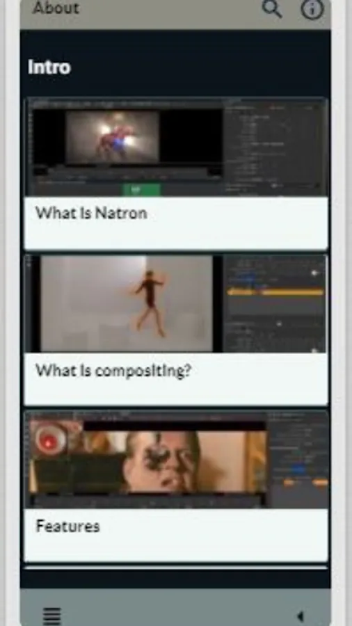 In general, this Natron guide App is divided into two features, namely: Intro Natron Natron Tutorials