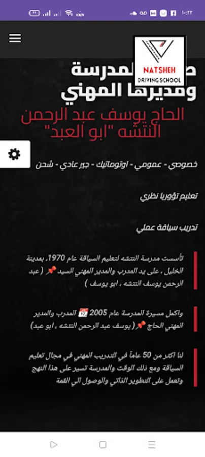 Al-Natsheh Driving School was established in 1970, in the city of Hebron, by the trainer and professional director, Mr. 📌 (Abdul Rahman Yousef Al-Natsheh, Abu Youssef)