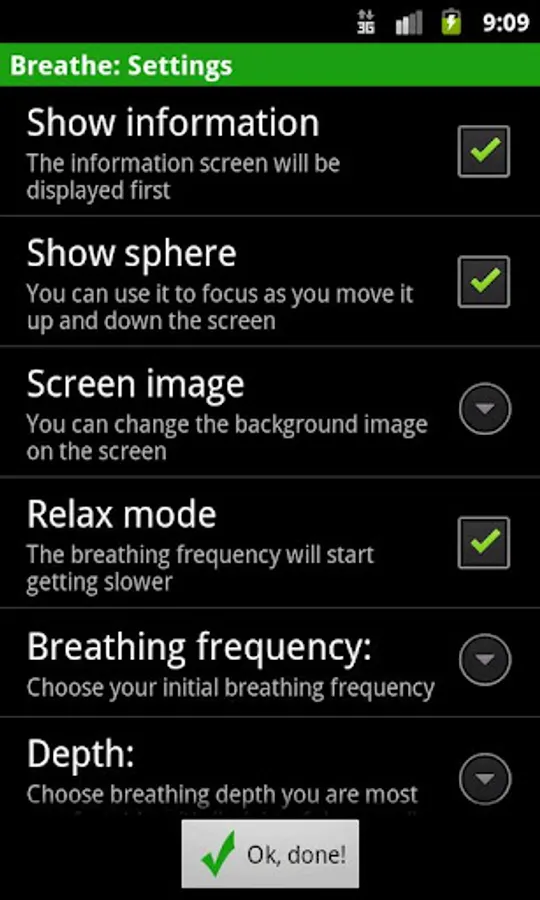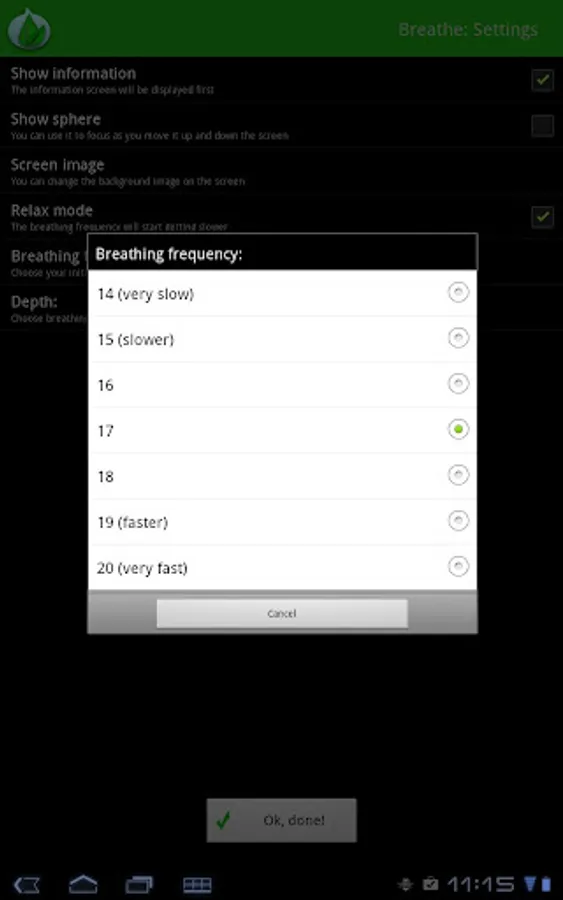 Once you access the application Breathe pressing Menu > Settings you can adjust the pace and depth of the breathing guide, you can also change the background image.