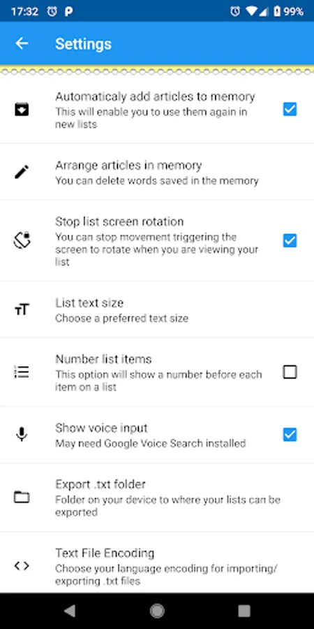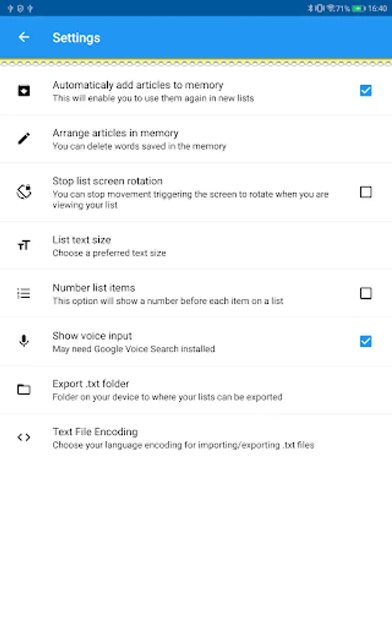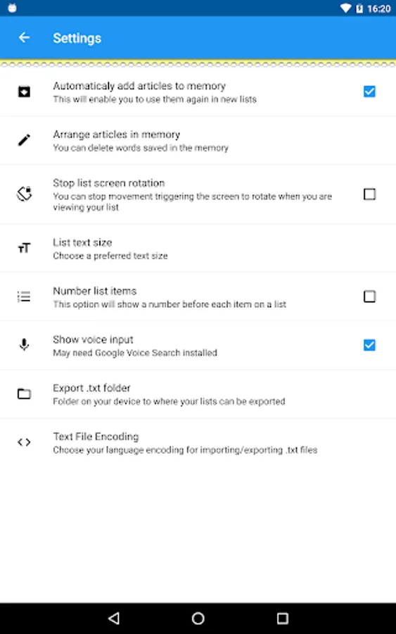 The app comes with a settings screen that enables you to stop the screen rotating when viewing a list (useful when shopping!), you can turn on list numbering, voice recognition, customize text size, turn the store items in memory on or off and edit items in memory (and empty it of course).