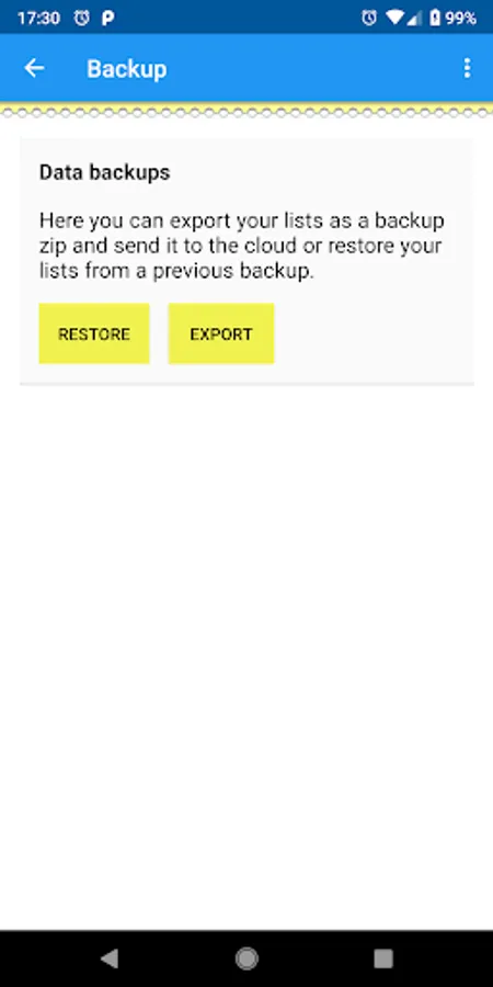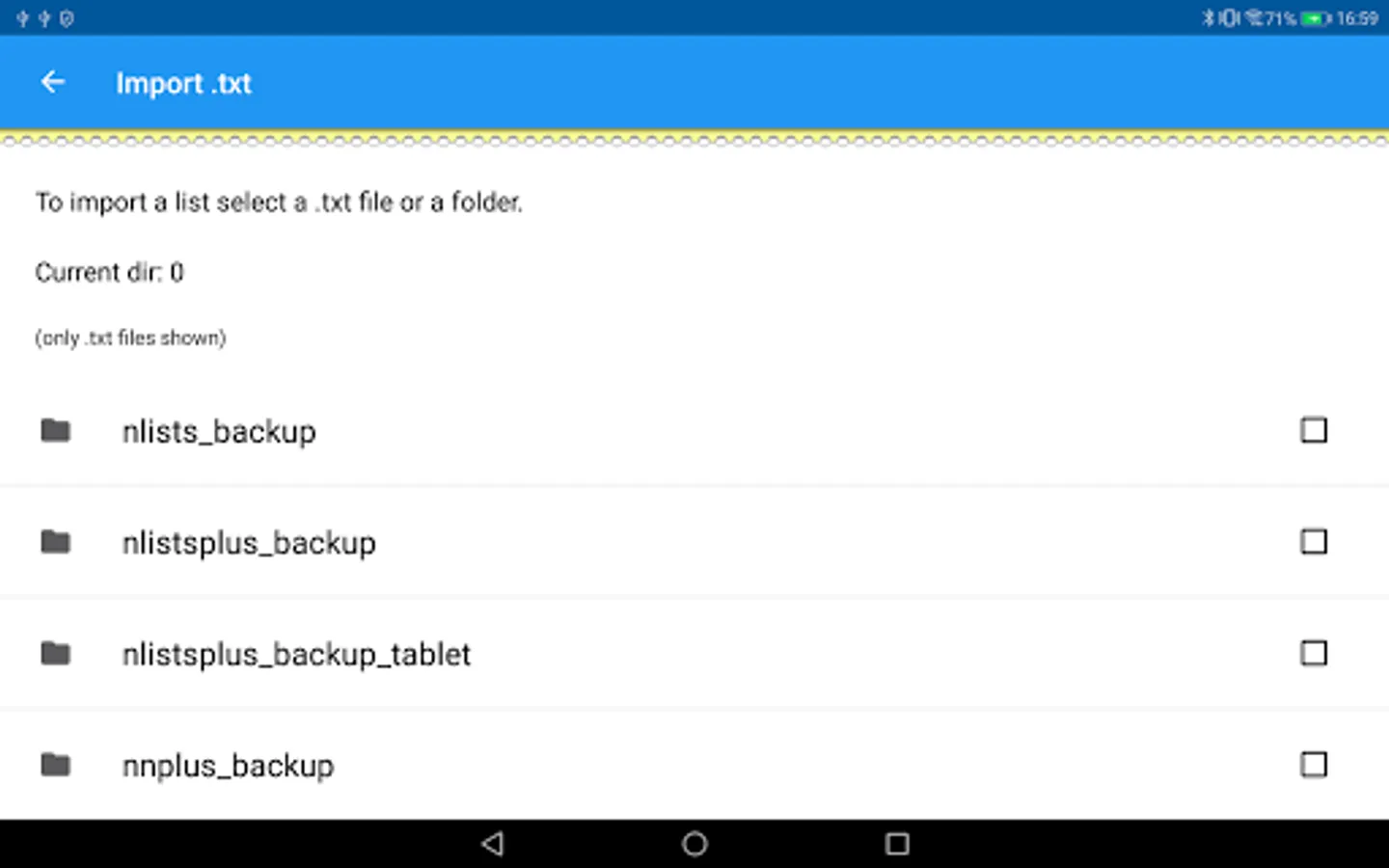 You can import / export your lists as .txt files, you can also use this app to open any .txt files on your device and import them.