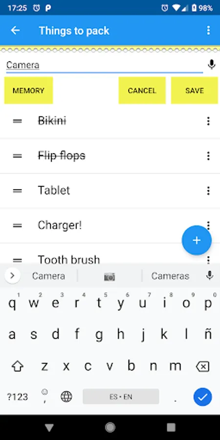 Another option for not typing much and saving time is to use the memory: the app will remember what you wrote in the past and will show you a list of items that you can select and add to your list. You can edit the memory to keep only the items you need.