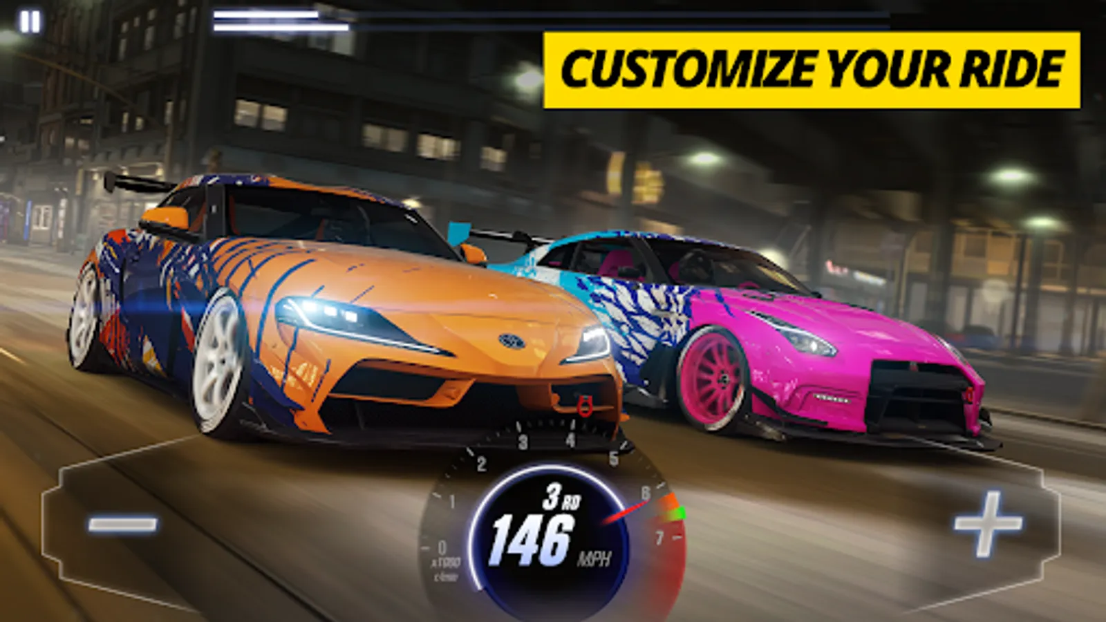 Show off car racing games and car play automobiles in your huge warehouse garage – CSR 2 features officially licensed vehicles, including Porsche, Aston Martin, Lamborghini, Pagani Koenigsegg, Toyota Supra Aerotop, Nissan Skyline GT-R (R34 NISMO S-tune), Chevrolet Camaro ZL1 1LE NASCAR or Mercedes-AMG F1 W11 EQ Performance #44