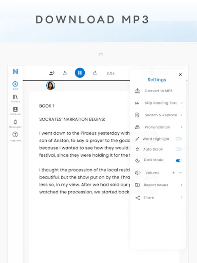 -- Camera Scanner: Listen to physical books and notes by using your mobile camera. Convert any piece of physical text into audio, which reads aloud to you. Just take a picture of the pages you wish to upload and you’re ready to start listening.