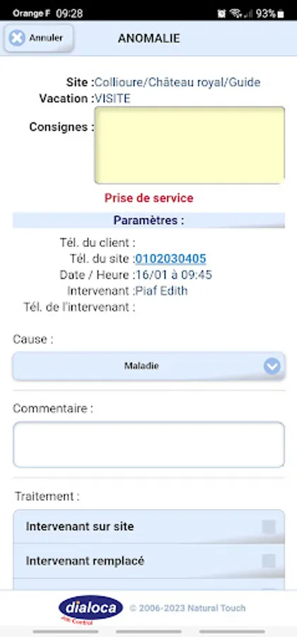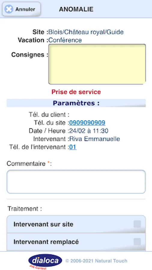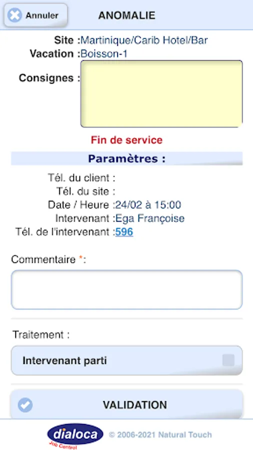 Application for supervision of intake and the end of service and treatment of anomalies.