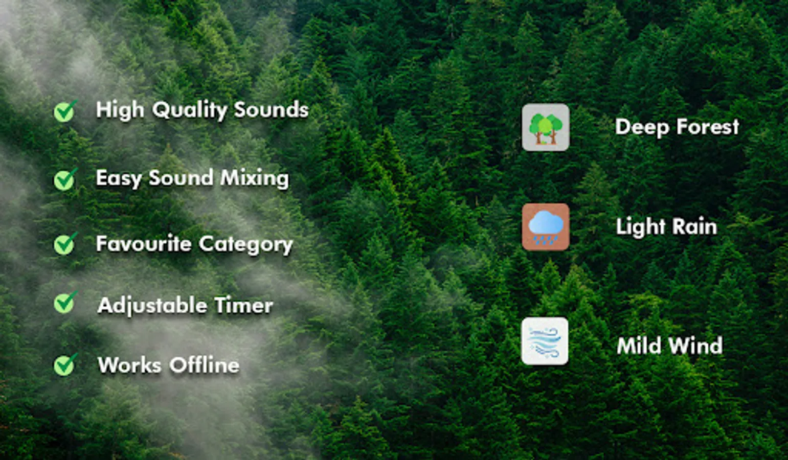 We provide Meditation Sounds: Sleep tracker Includes a huge number of sounds: Rain Sounds, Fires Sounds, Rainforest Sounds, Animal Sounds, Bird Sounds, and Ocean Sounds.