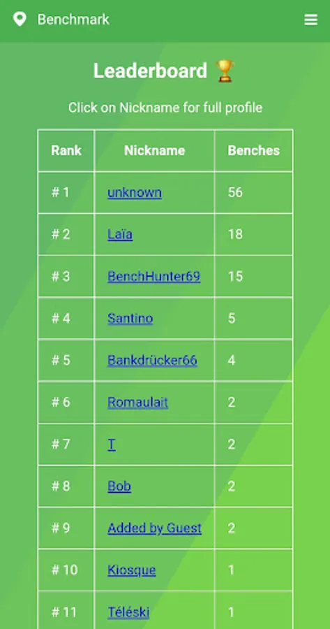 As well you are able to add Benches with our "Add a Bench" funtion, to add Benches that are not already listed on the Map. You are also able to climb the Leaderboard by adding Benches.