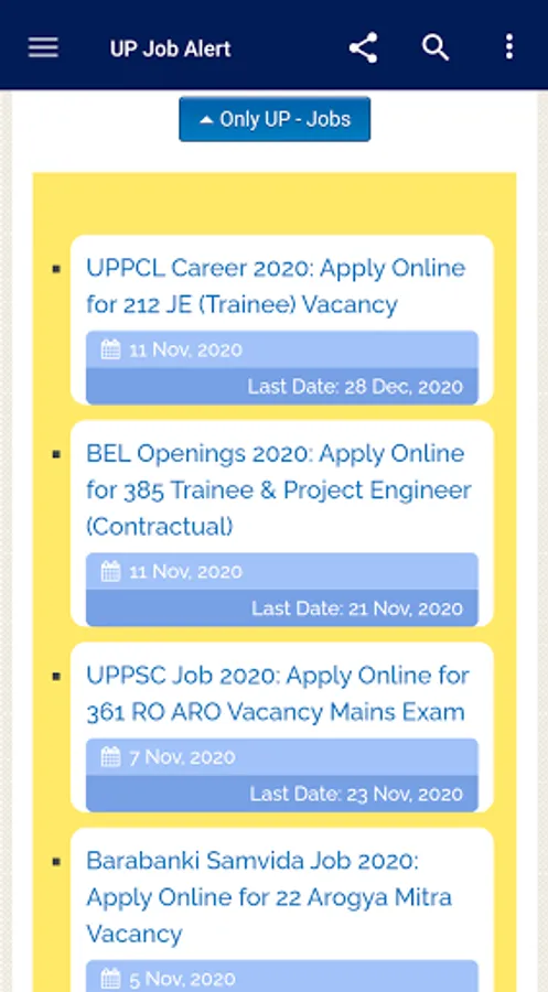Find UP Job Alert, Exam Alerts, Results, Vacancy Notifications, Answer Key. Uttar Pradesh Govt Job Alerts Android App for UPPSC, UPSSSC, UPPCL, Uttar Pradesh Postal circle, Bank jobs, Indian ARMY Recruitment Ralley Notifications, UP Police Job, Forest Guard Vacancy, Clerk Job, Teaching jobs, Central govt job in Uttar Pradesh, etc.