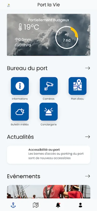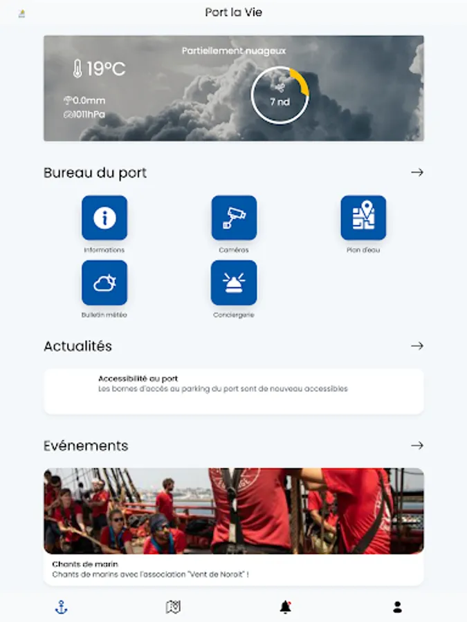 Here you will find various services such as real-time marine weather, access to port webcams, declaration of absences or incidents, emergency calls as well as access to news, information and port events.