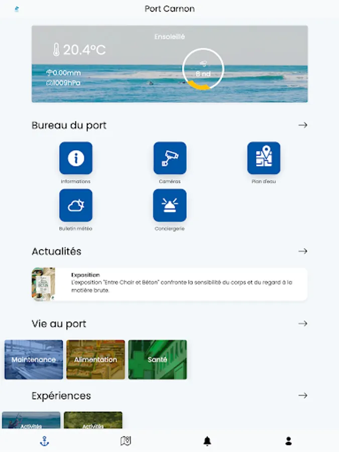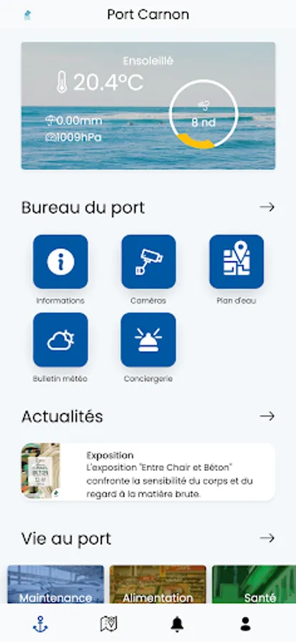 Here you will find various services such as real-time marine weather, access to port webcams, declaration of absences or incidents, emergency calls as well as access to news, information and port events.