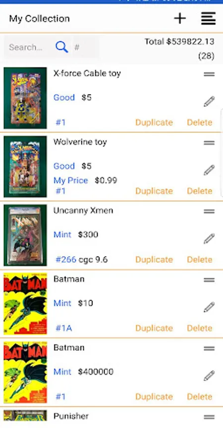You can easily organize and save your comic collection. You can add your own comics, toys, autographs, or whatever you like. Enter your own pricing and save your entire collection in our app.