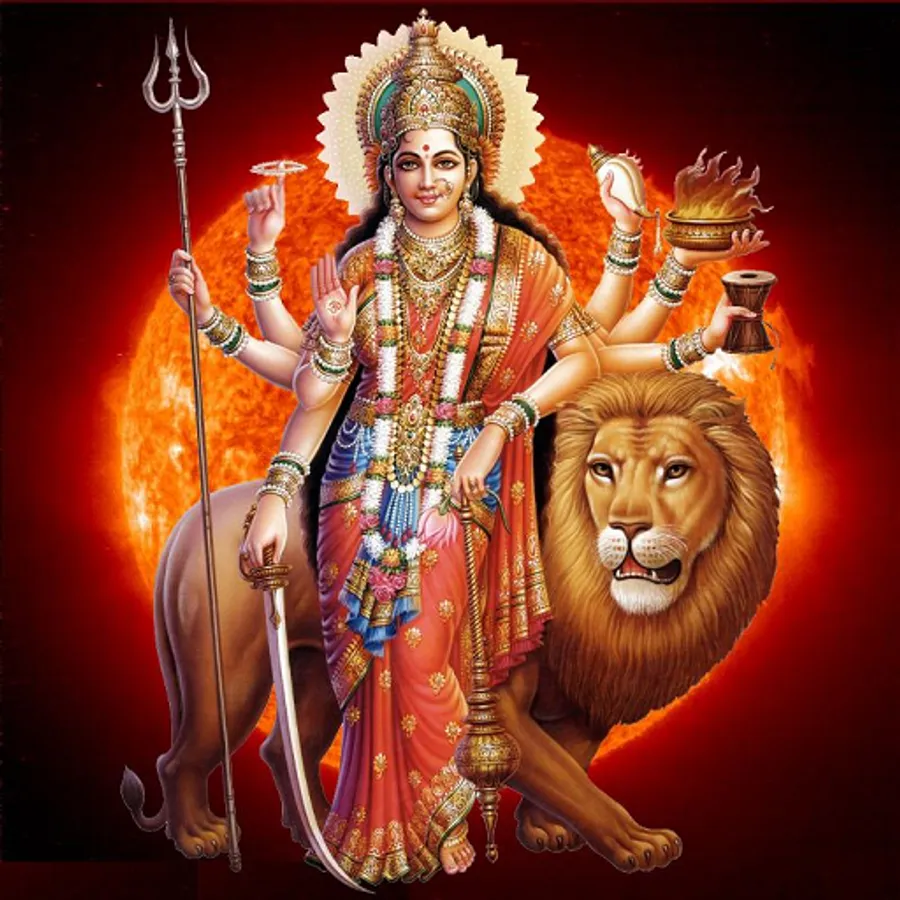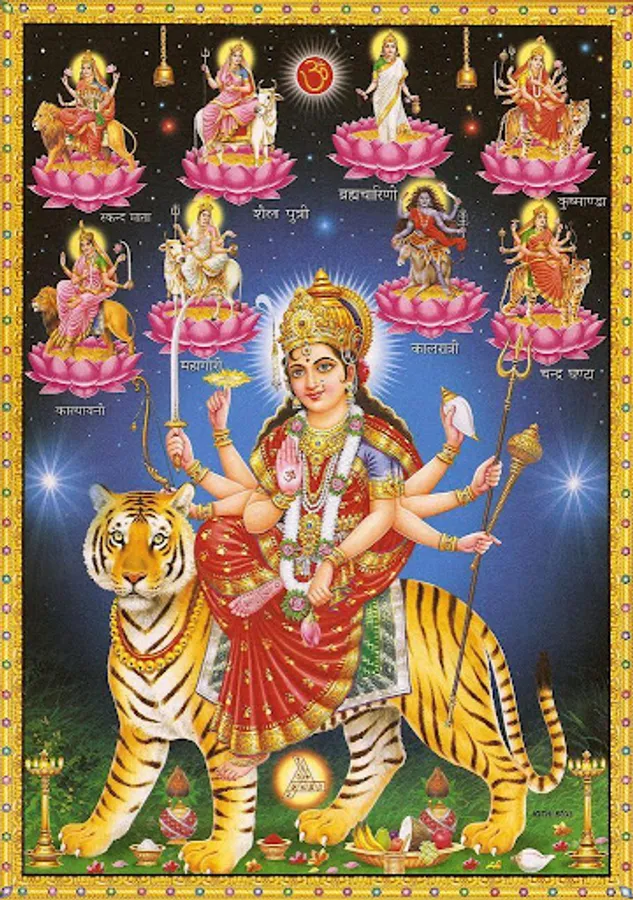 Durga is worshipped in different forms. She is a form of "Shakti". The evolution of Shri Maha Saraswati, Shri Maha Laxmi and Shri Mahakali (the 3 main forms of "Shakti") took place from Shri Brahma, Shri Vishnu and Shri Mahesh respectively. Each of these 3 deities gave rise to 3 more forms and hence in all, these 9 forms together are known as Nav-Durga.