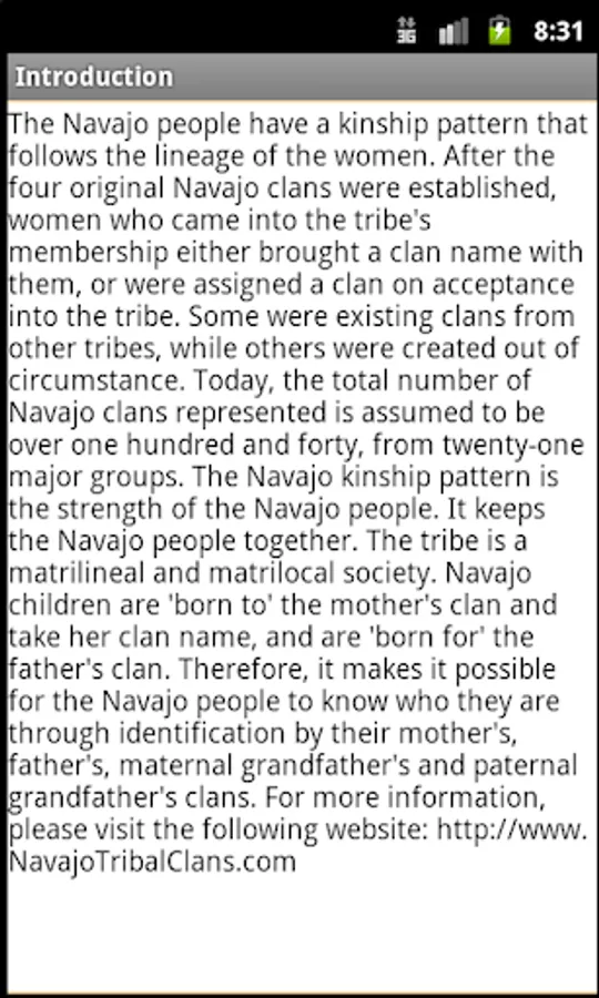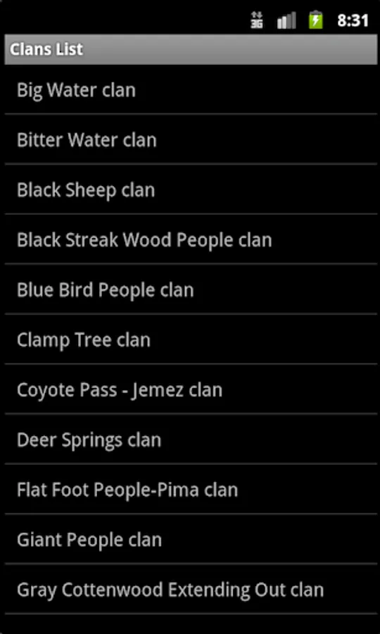 This is the ultimate clan dictionary for the Navajo people. "Navajo Clans" is a Android mobile device application that contains 80 Navajo clans. At a touch of a finger, you can easily find Navajo clans by searching the English word counterpart. As an enrolled member of the Navajo Tribe, I am providing all Navajo clans that i have learned growing up on the Navajo reservation. As such, all Navajo clans provided in this application are authentic and commonly known by the Navajo people.
