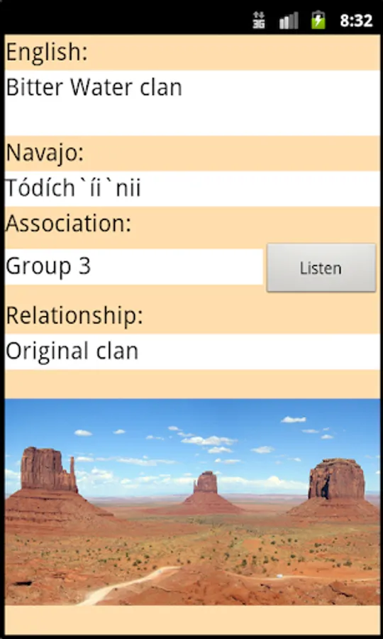 As a user friendly option, the "Navajo Clans" application provides sound files. The sound file is provided for every Navajo clan that allows the user to hear the Navajo clan being spoken.