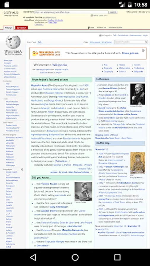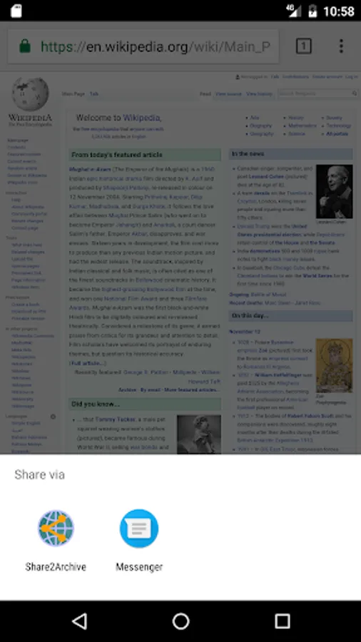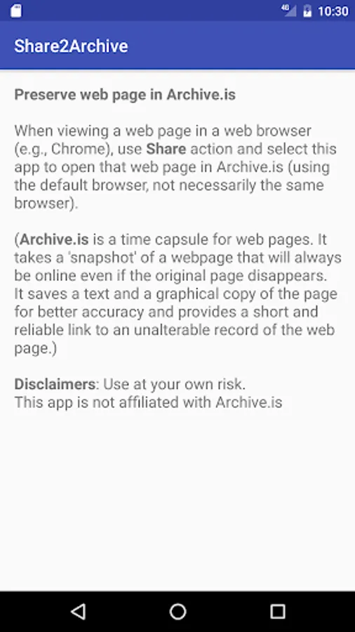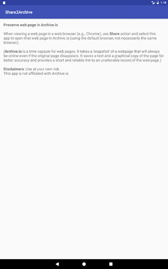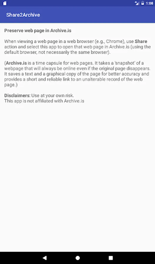 When viewing a web page in a web browser (e.g., Chrome), use Share action and select this app to open that web page in archive.today (using the default browser, not necessarily the same browser). Verified to work with many different browsers.