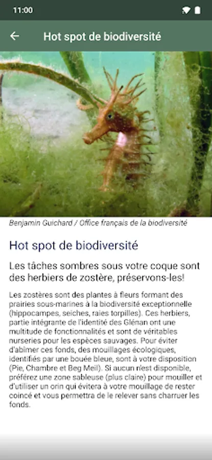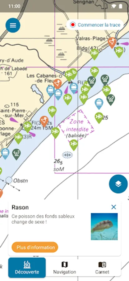 2/ In discovery mode, you can discover the marine environment through points of interest. They give you access to many photos and information on biodiversity. You can display different elements on your map: marine protected area sectors, environmental regulations, aerial fauna, underwater fauna, sea beds and best practices.
