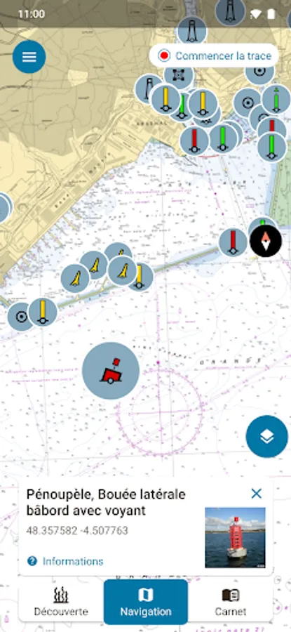 1/ In navigation mode, selected by default, you can choose to display different elements on the nautical chart: landmarks, fixed beacons, floating beacons, regulations and seagrass areas. (Note: official nautical documents are the only guarantee of your safety).