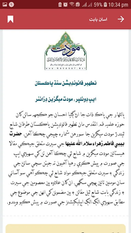 پالڻهار جي پاڪ ذات جا اڻ ڳڻيا احسان جو ڪجهه سالن کان حوزه علميه قم المقدس مان تطهير فائونڊيشن پاڪستان طرفان شايع ٿيندڙ مودت ميگزين جا سورهن شماره ڇپجي چڪا آهن۔ حضرت بيبي فاطمه زهراء سلام الله عليها جي سيرت متعلق جيڪي مقالا هيستائين مودت ميگزين ۾ شايع ٿي چڪا آهن تن کي سهيڙي ايپ جي صورت ۾ پيش ڪري رهيا آهيون ته جيئن سچي سائڻ جي زندگي ۽ سيرت متعلق جيڪو مواد شايع ٿي چڪو آهي سو آساني سان مومنين تائين پهچي سگهي۔ ان کان علاوه ٻين معصومين جي سيرت ۽ زندگي بابت شايع ٿيل مقالن ۽ ٻين مقالن کي انهن جي موضوع جي مطابق سهيڙي الڳ الڳ ايپز جي صورت ۾ پيش ڪيو ويندو۔