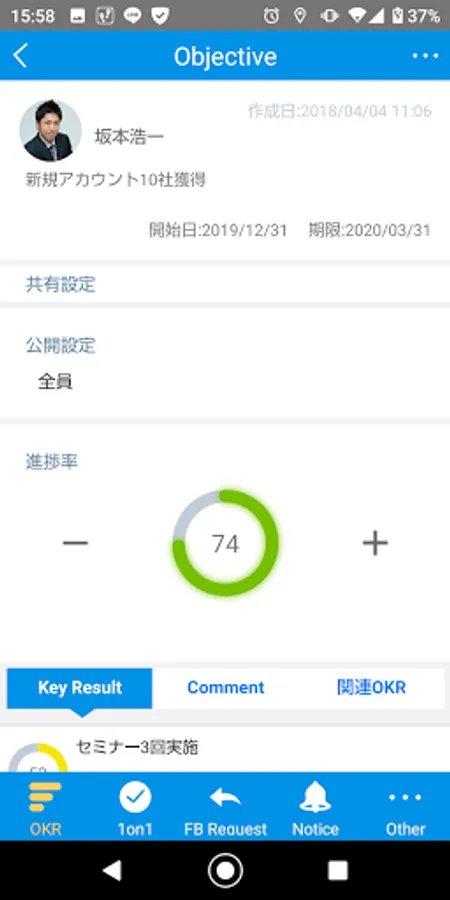 Share goals such as the content and progress of your Objective and Key Result with members of the organization. You can associate your goals with the goals of other members. You can also exchange comments about OKR with other members.