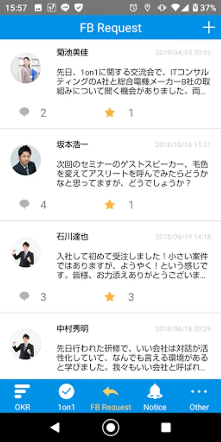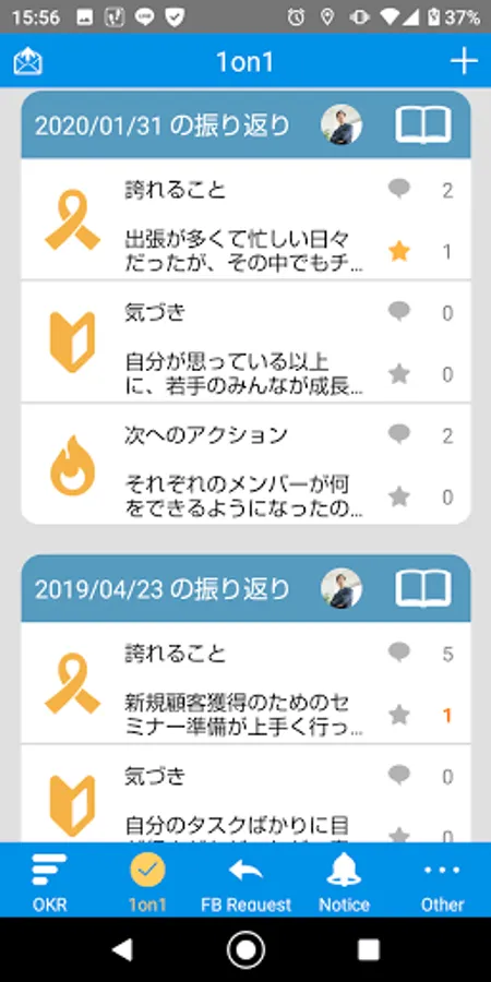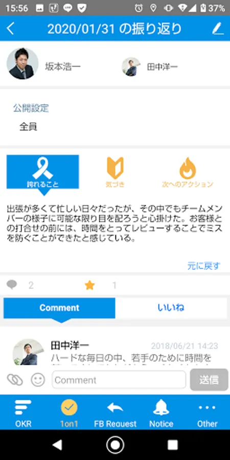 Easily register your awareness etc. obtained in 1on1. You can share the registered contents with your boss and other members and exchange comments. You can also send a 1on1 request to your boss.