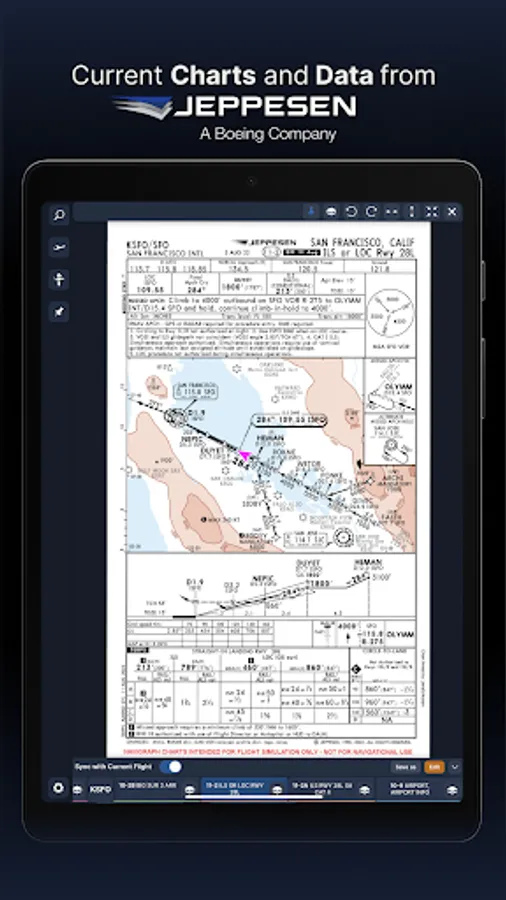 For the best user experience, we recommend using a tablet. Support for smaller displays is under development. Navigraph Charts is also available as a stand alone software on desktop computers, and can also be accessed on any web browser via https://charts.navigraph.com.