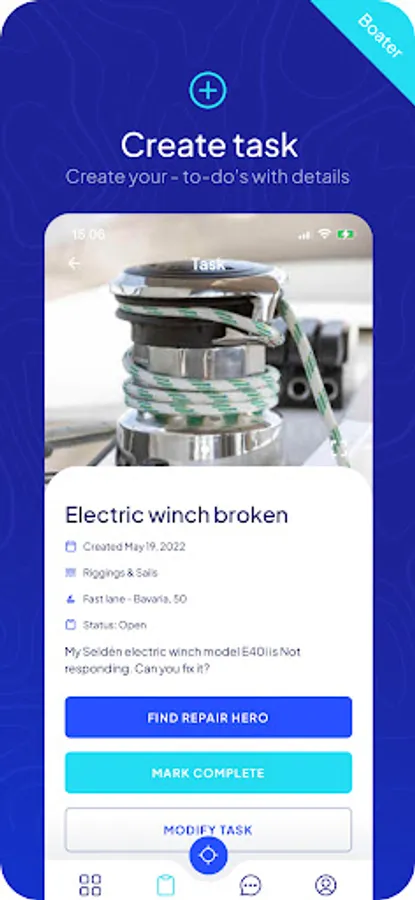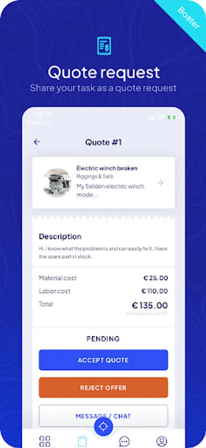 Boater: A Boater can create to-do’s (tasks) in the app and easily share them with a Repair hero as part of the quote request and also use them to manage all activities around the boat. A task includes detailed description and pictures and can be linked to service categories and boat details. When a quote request is forwarded to a Repair hero a chat opens between the Boater and the repair Hero.