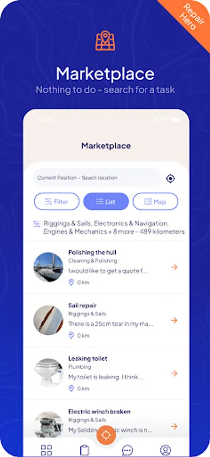 The Repair Hero can also search for task that has been put on the Navipair marketplace by the Boater.