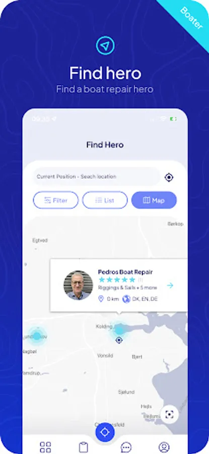 A Boater can search for Repair hero’s that have created a profile in the Navipair app. Location, specific destination and/or pre-determined service categories can be used to identify a Repair hero.