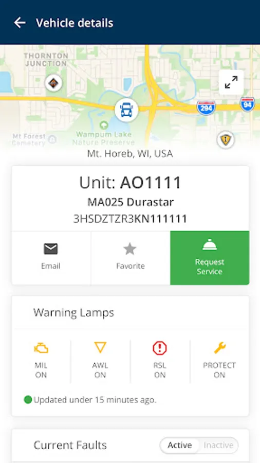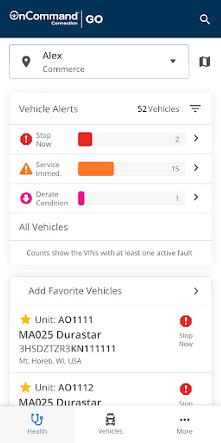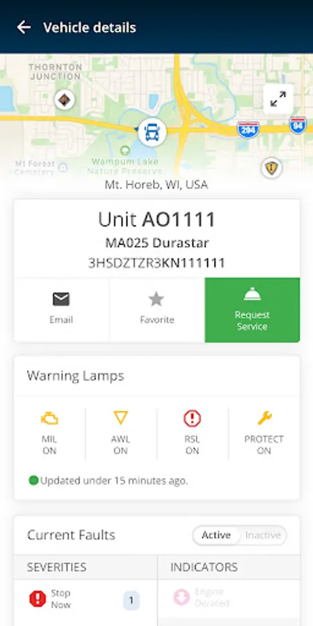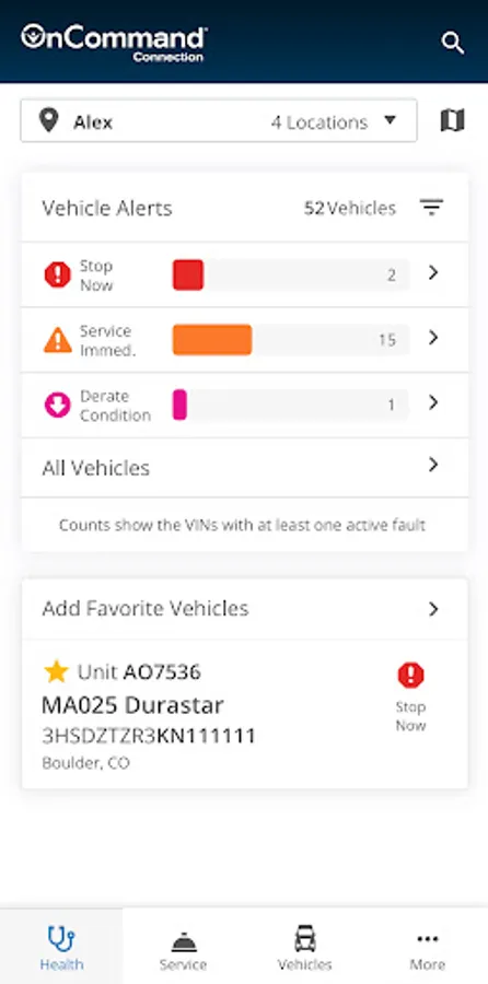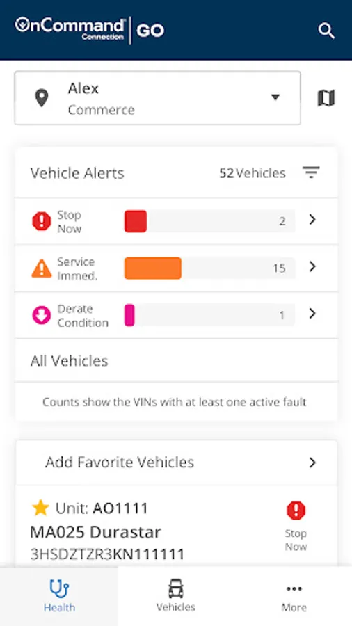 2. A summary of fault alerts across one or more vehicles, including severity of each