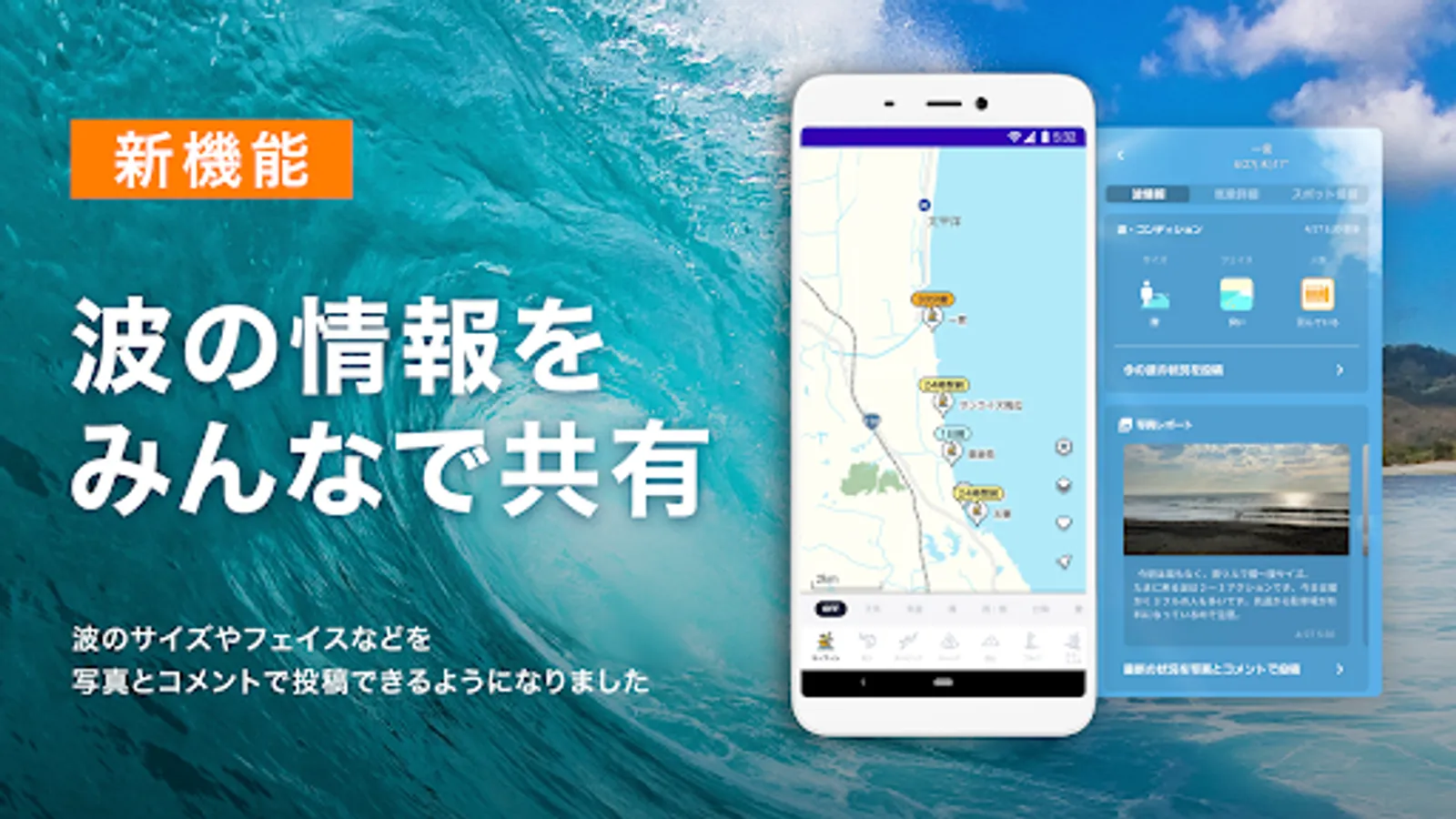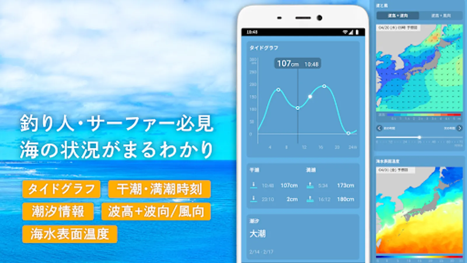 You can check detailed information such as tide graphs, waves height and wave direction / wind direction, seawater surface temperature map, etc. that show the sea conditions.