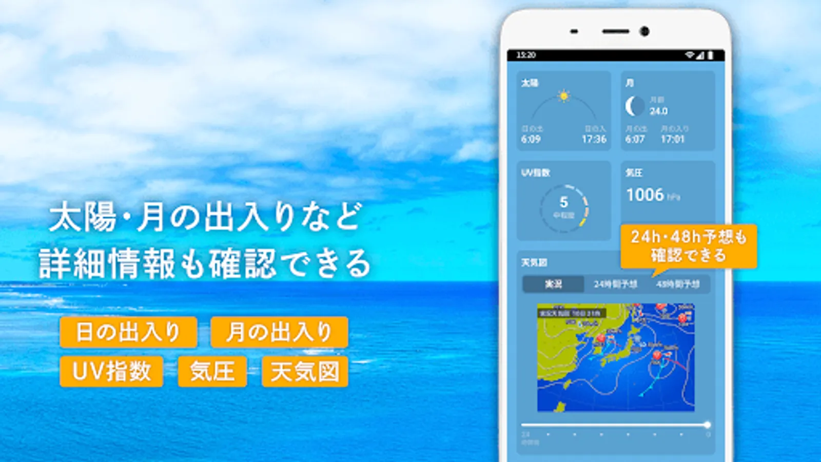 You can check the current and hourly weather, 7-day weather forecast, as well as sunrise / sunset / sunset / moonset times, UV index, and barometric pressure.