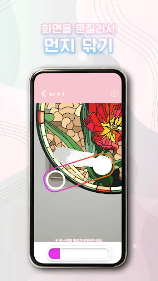 The unfinished stained glass is partially empty or painted over. Rub it and fill it with color to complete the design.