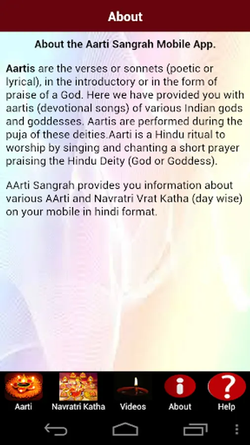 Aartis are the verses or sonnets (poetic or lyrical), in the introductory or in the form of praise of a God. AArtiSangrah provides you information about various AArti and Navratri Vrat Katha (day wise) in hindi format. You can read as well as listen aarti on your mobile without downloading any content.