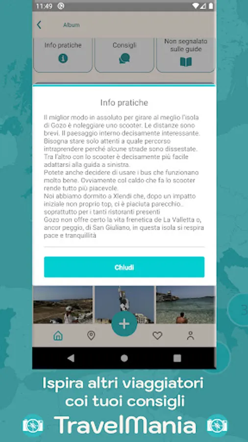 Collect all the best photos of your travels, geolocating them, thus becoming the photo collector of your adventures. You will always have with you all the photos of your travels, at hand and no longer scattered in a thousand devices or stuck in some hard disk. You can thus show your friends photos and travel tips at any time, even during an aperitif, dinner or chat. Or by telling them “go to my TravelMania profile, I uploaded everything there”. Through the travelmania.site site you can also upload the photos currently stored on your PC.