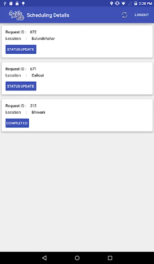 This application can be used for monitoring the assessor's during the assessment. Using this application assessor's can login and view the details of assessment for the current date. Once the assessor logins, He can give the updates about the assessment for the specific request-id. There are 4 simple stages to give the updates about the status of the assessment. For every stage Assessor's image is captured. When assessment is completed, he can logout or he can start with new assessment. But he can't give the updates for the same request-id which has been completed.