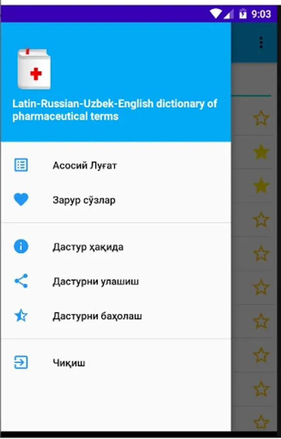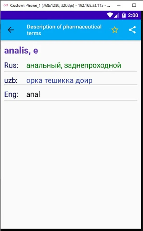 Luғatda lotin tilidagi pharmaceuticalsaga oid terminlar keltirilgan bбlib, ularning muқobillari rus, ўzbek va ingliz tillarida berylgan. Mazkur lukat pharmaceuticals soҳasida talim olayotgan bachelor, master student va ushbu soada faoliyat olib borayotgan mutahassislarga mўljallangan bўlib, ўz ichiga 2000 ta terminni olgan. Bundan tashgari bu luғatdan tarzhimonlar, linguistics soҳasida ilmiy tadқiқot ishlari olib boruvchi tayanch dkotorant, doctoral student wa mustaқil izlanuvchilar tomonidan ҳam foydalanishga tavsia ethyladi.