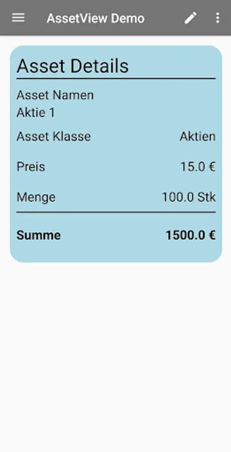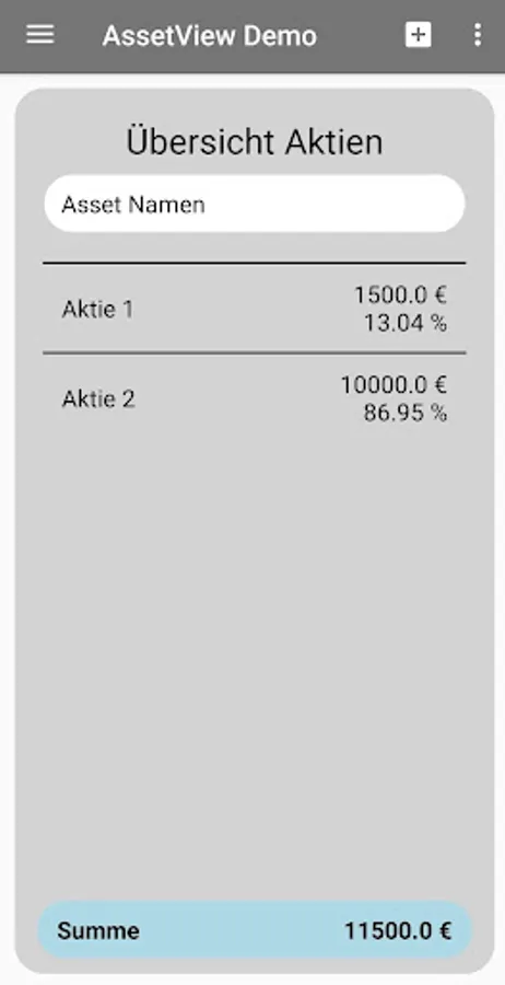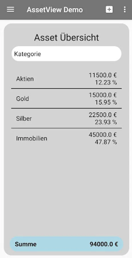 The app offers the possibility to manage one's own assets according to different categories and to edit them at any time with just a few simple steps. This way you always know how much assets you have, because your smartphone is almost always with you. The relative shares are also displayed so that you can see if there is an overweight in your portfolio.