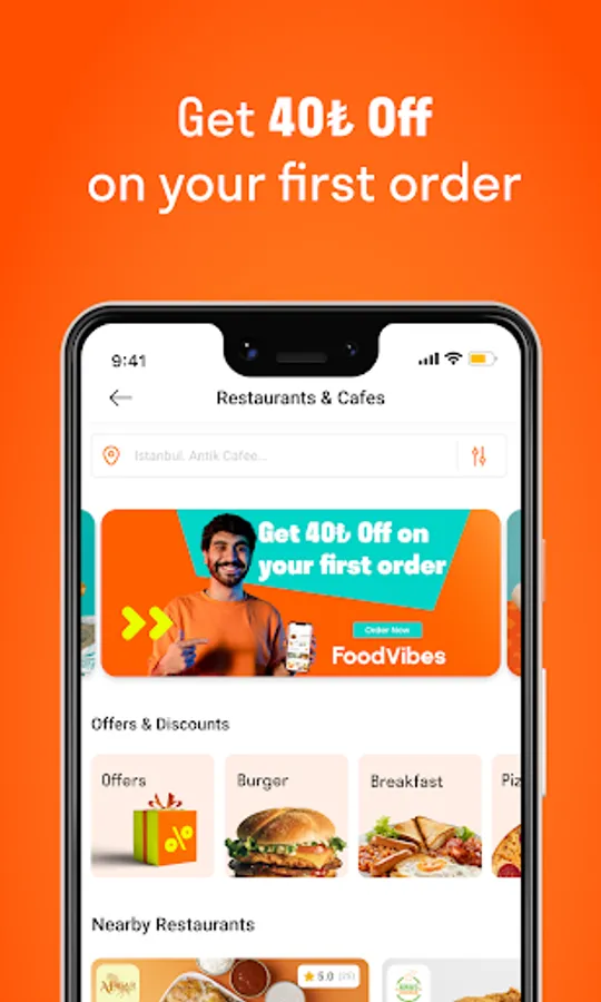 Are you looking for a food delivery app in Istanbul? Now, many restaurants are closer to you! FoodVibes provides delivery from many restaurants, whether you want a burger or a pizza. Oriental or Western food, chicken, or even sweets! All your options are available. Also, you can choose between special FoodVibes’ delivery, restaurant’s delivery, or pick up service, depending on your needs.
