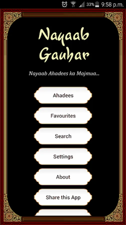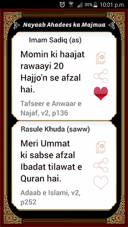 801 Topics par Quran ki aayaat, RasoolAllah (s.) aur Aimma-e-Athaar (a.s.) ki chuninda ahaadees ka majmua. Yeh ek personal collection hai jiska Urdu / Hindi zabaan mein tarjuma kiya gaya hai. Is APP ka TEXT Roman Script mein hai aur aap is APP ki har Hadees / Ayat ko kisi bhi tarah SHARE kar sakte hain. Taqreeban 65500 "Nayaab Gauhar" aap ki khidmat mein pesh karte hain. Iltemas-e-dua