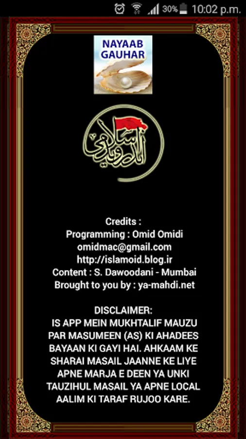 IS APP MEIN MUKHTALIF MAUZU PAR QURAN KI AAYAAT, MASUMEEN (AS) KI AHADEES, DUAEIN AUR RIWAYAAT KITAABO'N SE BAYAAN KI GAYI HAIN. AHKAAM KE SHARA'I MASAIL JAANNE KE LIYE APNE MARJA E DEEN YA UNKI TAUZIHUL MASAIL YA APNE LOCAL AALIM KI TARAF RUJOO KARE.