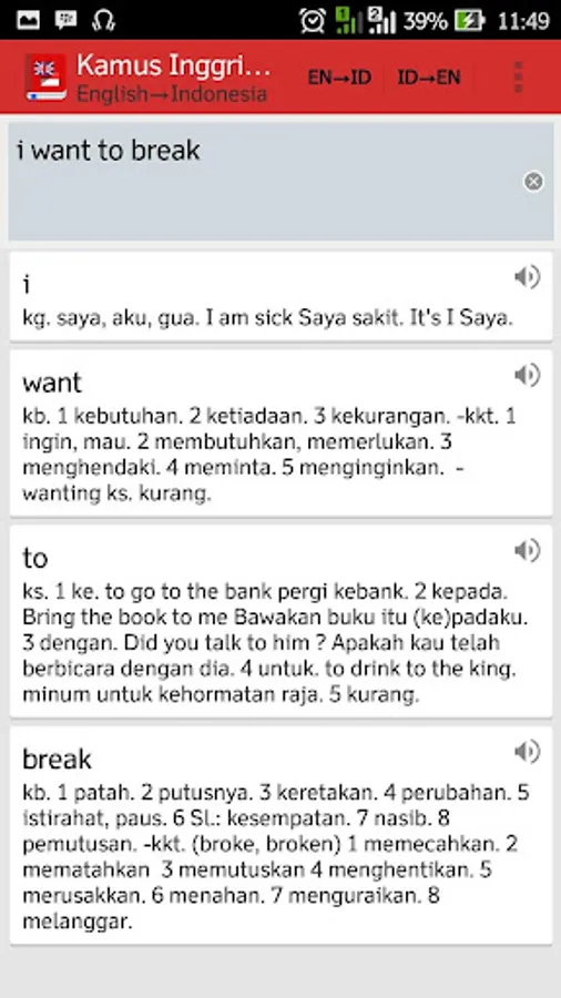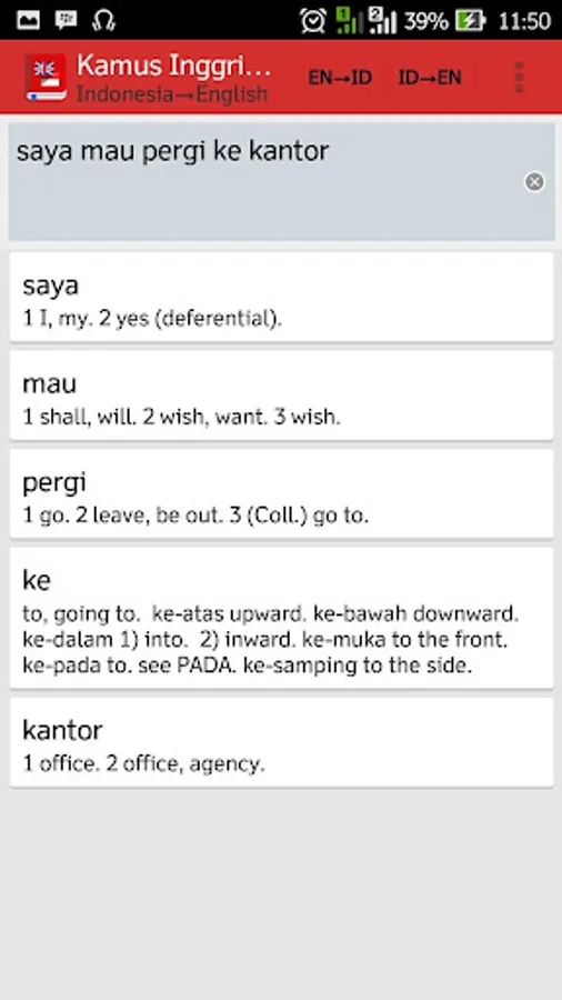 Aplikasi kamus penterjemah bahasa Inggris - Indonesia dan Indonesia Inggris secara offline. Dilengkapi dengan fitur penterjemah kalimat perkata.