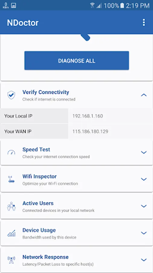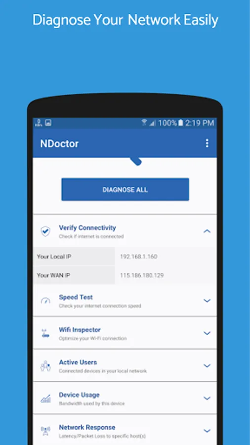 NAYAtel NDoctor is a FREE diagnostics app which can provide better understanding of your network and help to optimize it for optimum performance. Use NAYAtel NDoctor to improve your internet experience. NDoctor comes with following features: