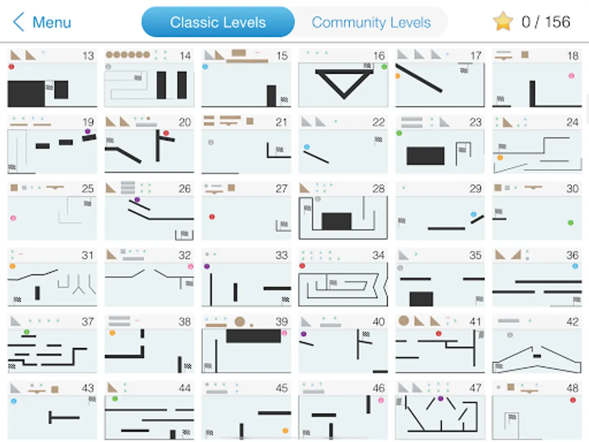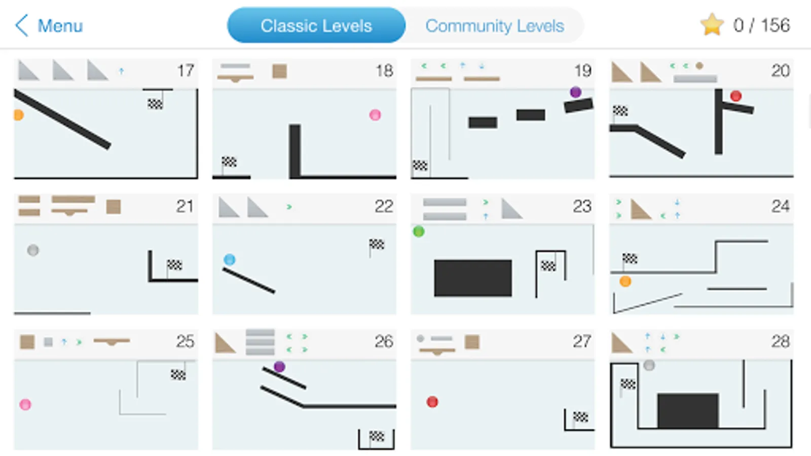Using the pieces and powerups provided, come up with creative solutions to get the bubble to the goal! There are two types of pieces, wood and metal. Wood pieces are affected by gravity when you tap Start, while metal ones stay where you placed them. Use powerups to give the bubble speed boosts and even reverse gravity! Don't want to start at the beginning? You can skip around to your liking and jump right into the 156 exciting levels (start with 48 levels, then upgrade to the full version of Bubble Ball for all 156 levels).