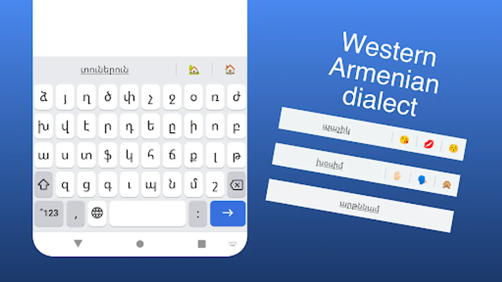 * Emojis are displayed in real-time in the Suggestion Bar as words are typed (for example, feelings such as ուրախ, տխուր, ապշած; things like ծաղիկ, սիրտ, լուսին; actions like վազել, նայել / նայիլ, քնել / քնանալ, etc.)